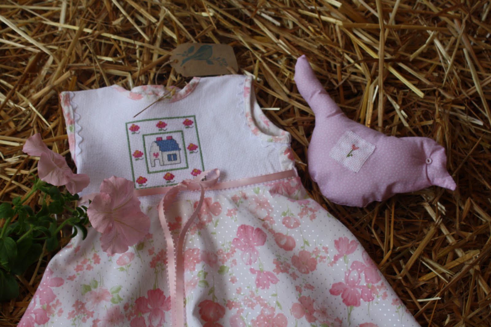 Uno de los vestidos que puse en venta en mi stand, esta hecho con tela de flores en rosa con puntitos, se llama brillantina.